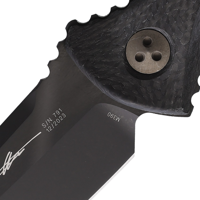 8.17″” (20.75cm) overall. 3.75″” (9.53cm) black DLC coated premium steel blade. Carbon fiber handle. Full, extended tang. Lanyard hole. Black Kydex belt sheath. Boxed. No 3rd Party Sales (must be sold from your store or your web site, not a third party site such as Amazon, eBay, etc)