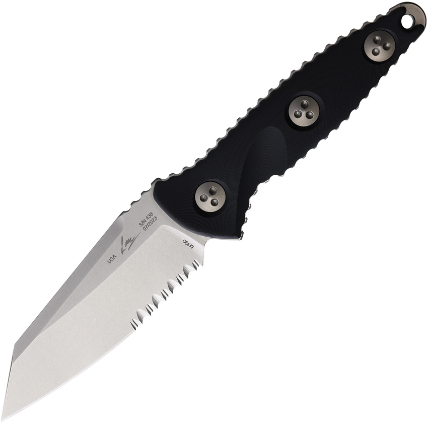 8.17″ (20.75cm) overall. 3.75″ (9.53cm) stonewash finish partially serrated Bohler M390 stainless Wharncliffe blade. Black G10 handle. Full, extended tang. Lanyard hole. Black Kydex belt sheath. Boxed.