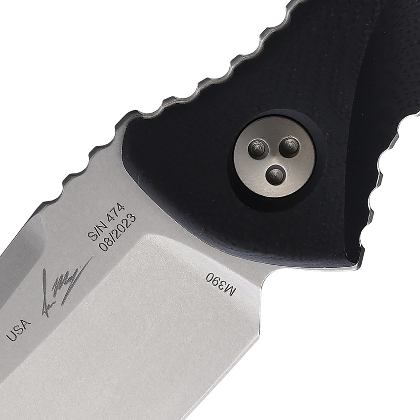 8.17″ (20.75cm) overall. 3.75″ (9.53cm) stonewash finish Bohler M390 stainless Wharncliffe blade. Black G10 handle. Full, extended tang. Lanyard hole. Black Kydex belt sheath. Boxed.