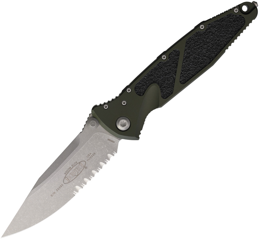 5.13″ (13.03cm) closed. 4″ (10.16cm) Apocalyptic finish partially serrated premium steel blade. Woodland green aluminum handle with black traction insert. Thumb stud. Lanyard hole. Glass breaker. Pocket clip. Boxed.