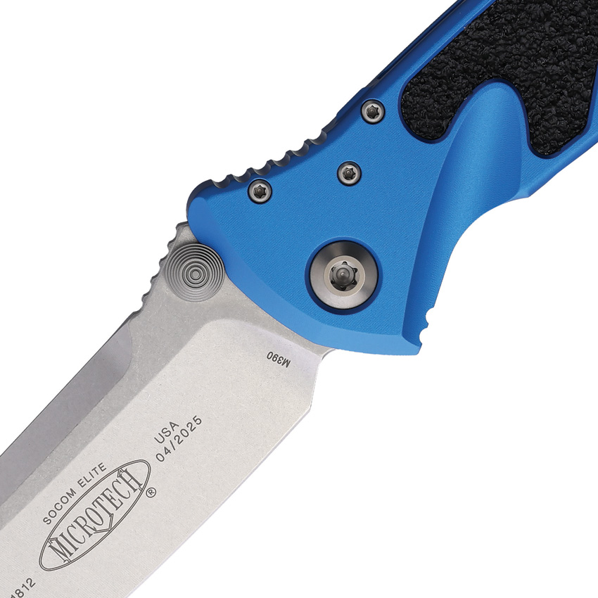 5.13″ (13.03cm) closed. 4″ (10.16cm) stonewash finish premium steel blade. Blue aluminum handle with black traction insert. Thumb stud. Lanyard hole. Glass breaker. Pocket clip. Boxed.