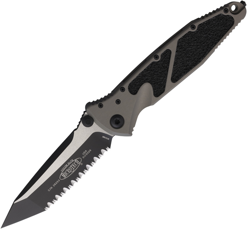 5.13″ (13.03cm) closed. 4″ (10.16cm) two-tone finish serrated premium steel tanto blade. Gray aluminum handle with black traction insert. Thumb stud. Lanyard hole. Glass breaker. Pocket clip. Boxed.