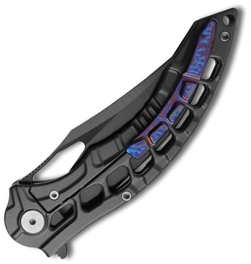 5″ (12.7cm) closed. 3.63″ (9.22cm) black satin finish Vanax steel clip point blade. Dark gray PVD coated titanium handle. Extended tang. Thumb pull. Lanyard hole. Pocket clip. Boxed.