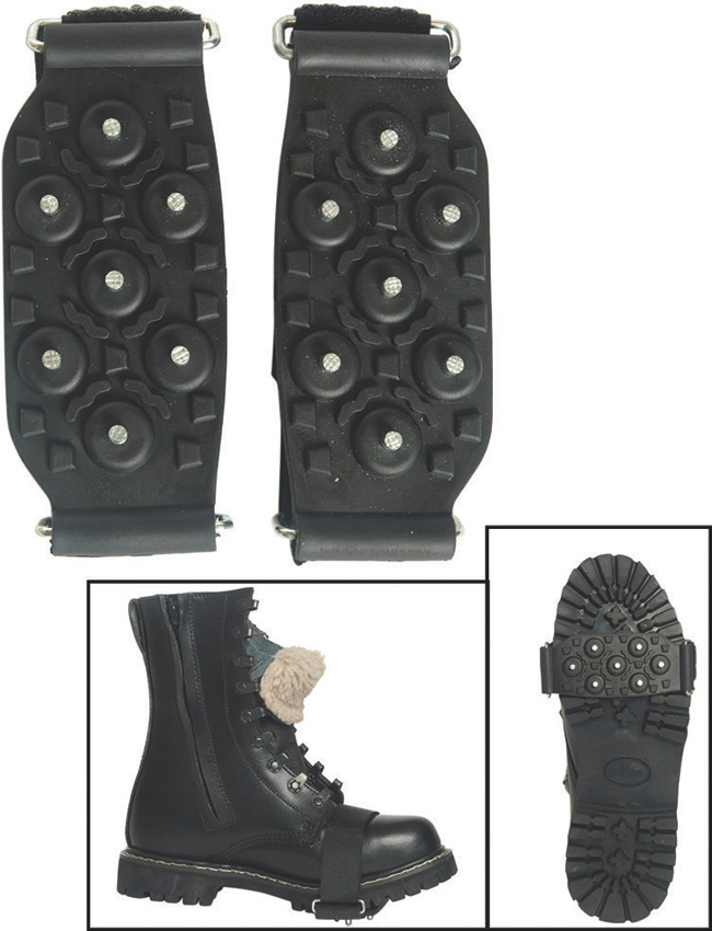 Steel spikes with thermoplastic rubber outer. 360 degree traction. Adjustable hook and loop closure. Clam packed.