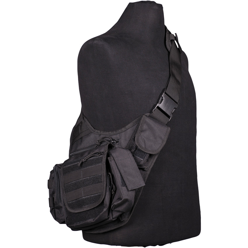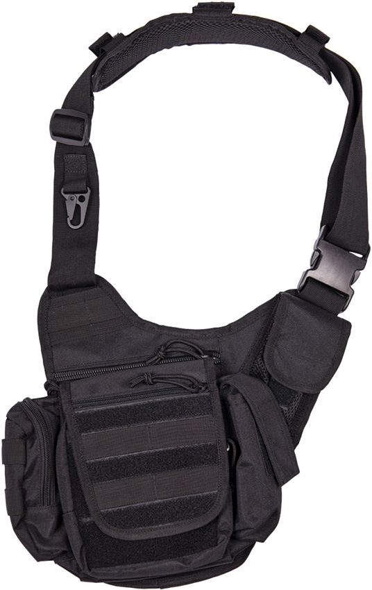 Wide, adjustable and padded shoulder strap. Three patch outside pockets with hook & loop closure. Patch mobile pocket with additional net pocket. Main pocket with snow apron and cord stopper. Fixation of bag on belt by hook & loop closure. Polyester construction. Color: Black. Bulk packed.