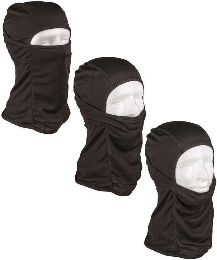 Will cover neck, chin, mouth and nose. Wearable under a helmet. Polyester construction. Color: Black. Bagged.