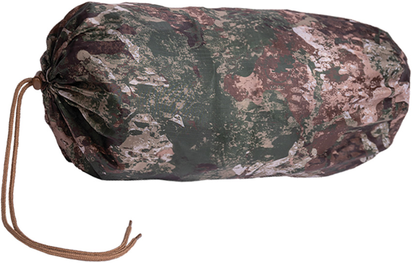 Dimensions: 88.5″ x 33.5″. Pack size: 15.75″ x 3.13″. Waterproof and breathable. Generous cut that is suitable for most sleeping bags. Two-way zipper on side. Wide snap fastener cover molding. Head area with elastic band and hook and loop closure. Phantomleaf camo pattern. Comes with stuff sack. Bulk packed.