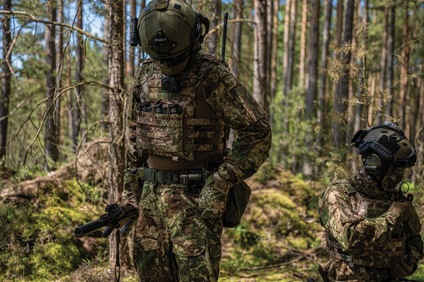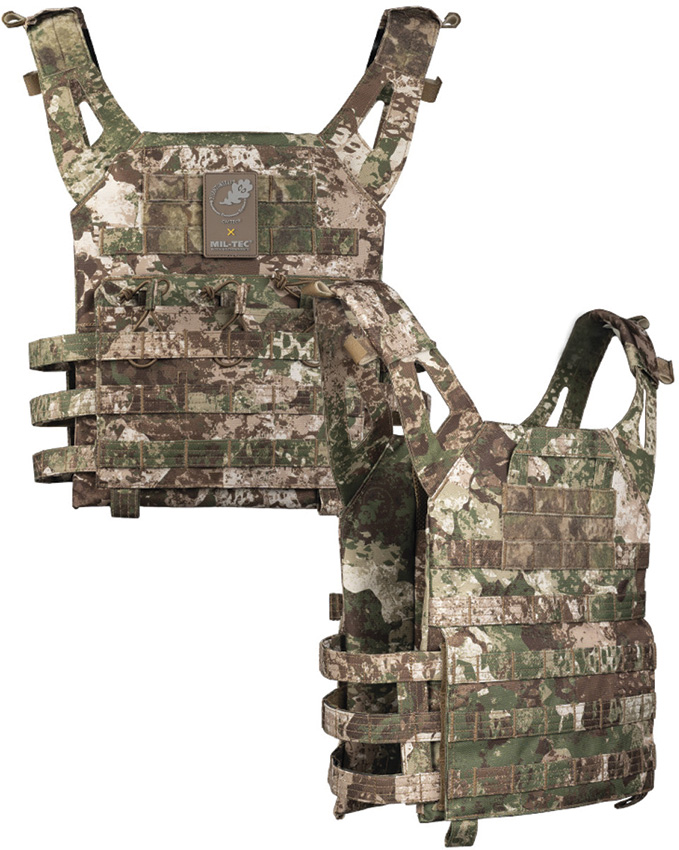 TPR shoulder straps. MOLLE system on front, back and side straps. Three magazine pouches on front. Three elastic loops on front to fix the magazines. Small hook and loop closure pocket on front. Three hook and loop closure stripes on front and back to fix patches. Shoulder straps can be opened by hook and loop closure. Emergency drag handle. CIV-TEC WASP I Z2 camo. Polyester (600D Oxford) construction. Bulk packed.