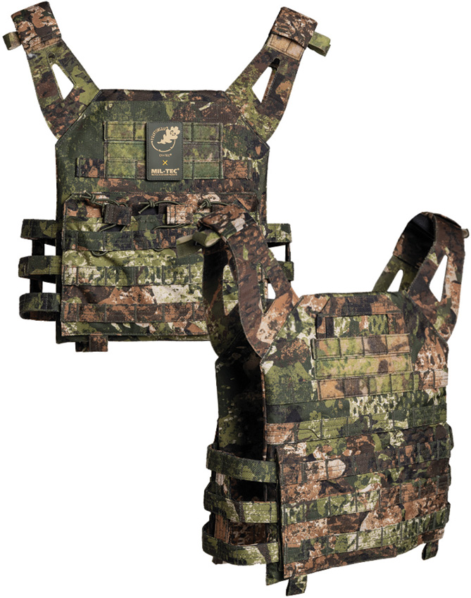 TPR shoulder straps. MOLLE system on front, back and side straps. Three magazine pouches on front. Three elastic loops on front to fix the magazines. Small hook and loop closure pocket on front. Three hook and loop closure stripes on front and back to fix patches. Shoulder straps can be opened by hook and loop closure. Emergency drag handle. CIV-TEC WASP I Z3A camo. Polyester (600D Oxford) construction. Bulk packed.