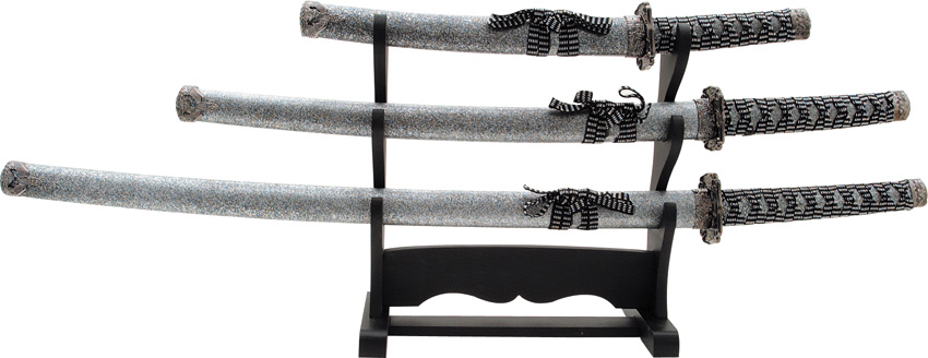 Contains one 37 1/8″ overall Katana with 26″ stainless blade, one 29 7/8″ overall Wakizashi with 19 3/4″ stainless blade and one 19″ overall Tanto with 11 1/8″ stainless blade. Each sword has a black and white cord wrapped handle with black finish sculpted cast metal tsuba and pommel. Black and silver flecked wooden scabbard with black finish cast metal fittings. Comes with a black lacquer finish wooden display stand. Mfr Part Number: JBL-W4.