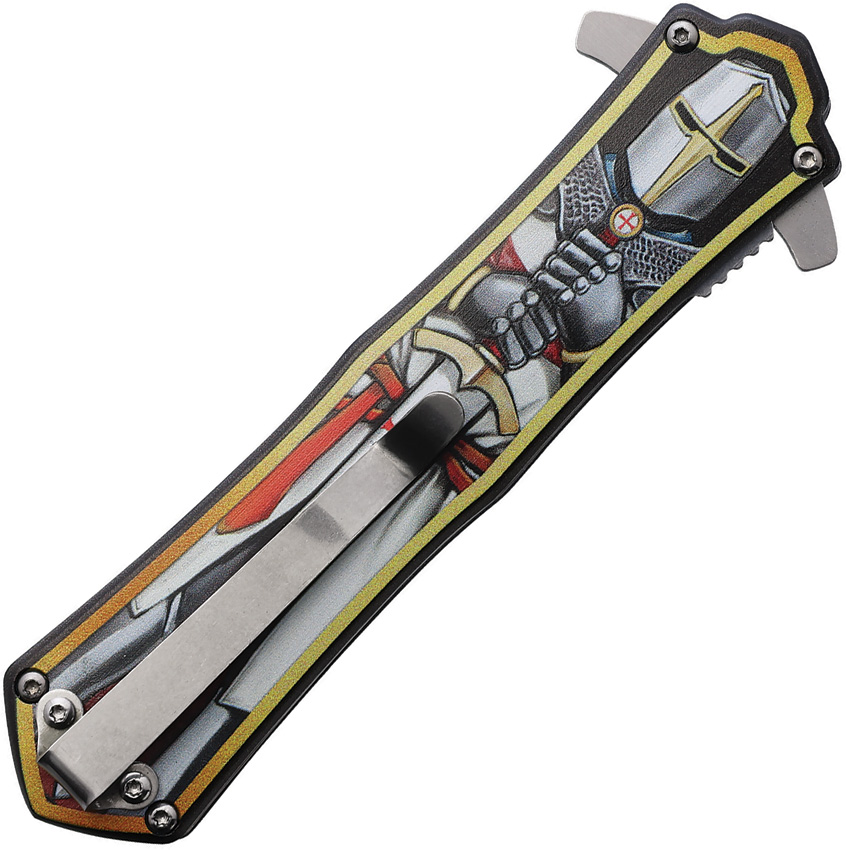 Assisted opening. 5.13″ (13.03cm) closed. 4″ (10.16cm) satin finish false edge stainless spear point blade. Aluminum handle. Extended tang. Pocket clip. Knight handle artwork. Boxed.