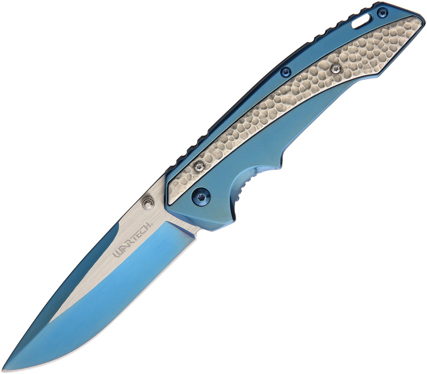 Assisted opening. 4.75″ closed. 3.75″ two-tone finish stainless drop point blade. Blue anodized stainless handle. Pocket clip. Lanyard hole. Thumb stud. Boxed.