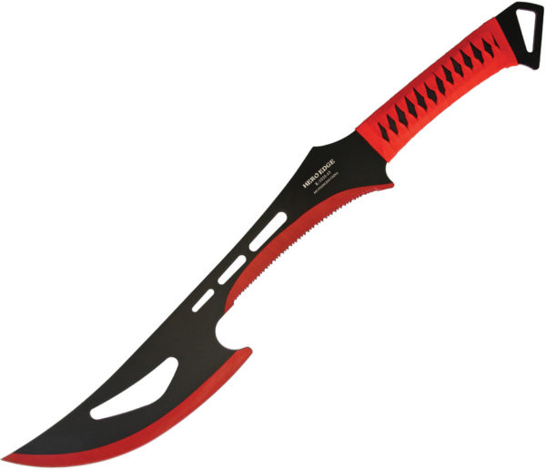 24.25″ overall. 17″ two-tone finish partially serrated 440 stainless clip point blade. Red cord wrapped handle. Full, extended tang. Lanyard hole. Black nylon belt sheath. Boxed.