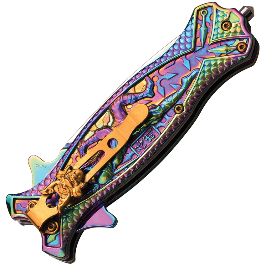 5″” (12.7cm) closed. 3.75″” (9.53cm) spectrum TiNi coated stainless blade. Spectrum TiNi finish stainless handle. Finger ring. Extended tang. Glass breaker. Pocket clip. Martial arts handle artwork. Boxed.