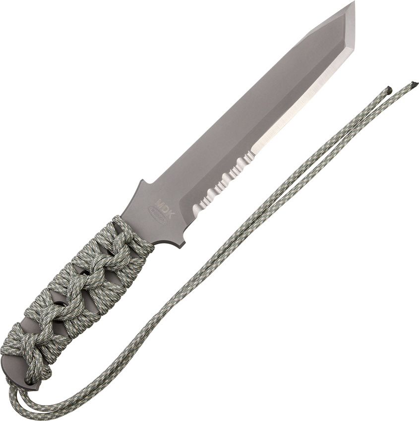 11 1/2″ overall. 7″ partially serrated tanto blade. Blade is .250″ thick. Blade has a superior wear resistance and should never rust or corrode. One piece titanium construction. Skeletonized handle with ACU cord wrap. Developed in response to the military and Special Operation’s request for both a CQB armor-piercing knife and as a heavy duty, non-magnetic pry bar tool when digging into rocky terrain and hard packed soil to locate and remove land mines. It can easily be attached to the hip or thigh with the included black nylon belt sheath. Sheath also has front utility pocket.