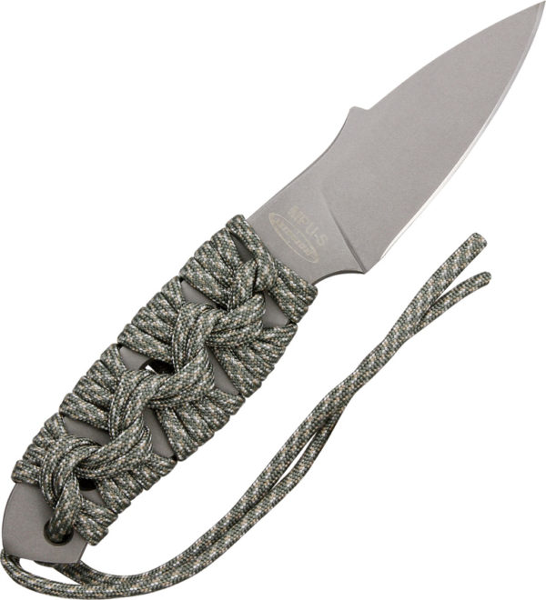 7″ overall. 3″ standard edge A2 tool steel blade. Blade is .187″ thick. Full tang. Skeletonized handle with ACU cord wrap. Designed from the requirements of the Special Forces, Special Operations, and SWAT communities that needed a smaller knife that could be strapped onto the forearms or tucked into a boot. Molded black Kydex sheath with black nylon belt loops.