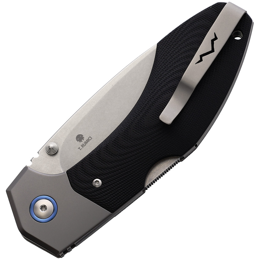 4.5″ (11.43cm) closed. 3.5″ (8.89cm) stonewash finish Bohler M390 stainless blade. Black G10 handle. Titanium bolster(s). Thumb stud. Lanyard hole. Pocket clip. Black nylon zippered storage case. Boxed.