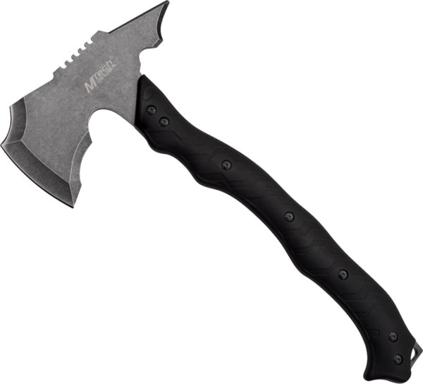 14.5″ overall. 7.13″ stonewash finish stainless axe head with 3.5″ cutting edge. Black rubberized ABS handle. Lanyard hole. Black nylon sheath.