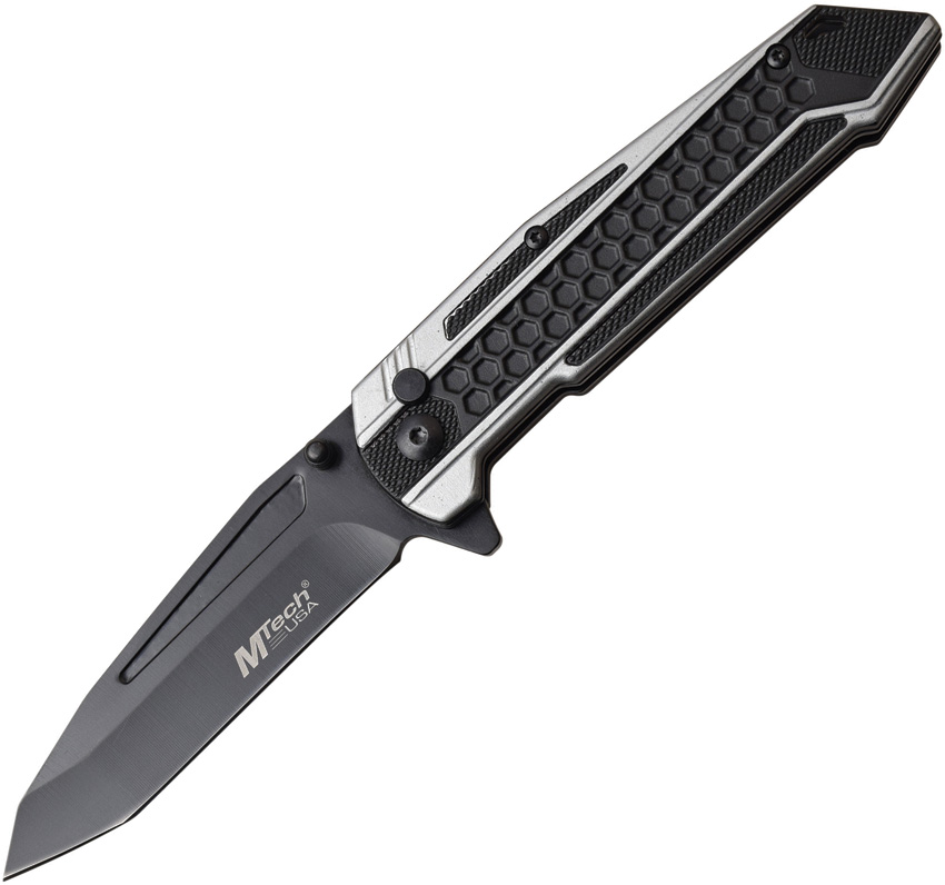 MTech Knives – Button Lock Knife with Black and Gray Anodized Aluminum Handle. 4.75″ closed. 3.5″ black finish 3Cr13 stainless tanto blade. Black and gray anodized aluminum handle. Extended tang. Thumb stud. Lanyard hole. Pocket clip. Boxed. Made in China.