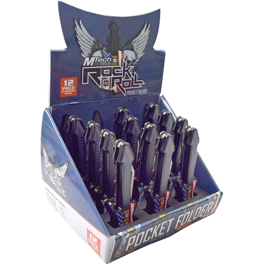This folding pocket knife is 3.75″ closed. 2.5″ satin finish stainless clip point blade. Guitar shaped aluminum handle. Pocket clip. Thumb pull. 12 pieces-three each of American flag artwork, skull with wing artwork, flame artwork, and dragon artwork. Cardboard countertop display box. Boxed. Made in China.
