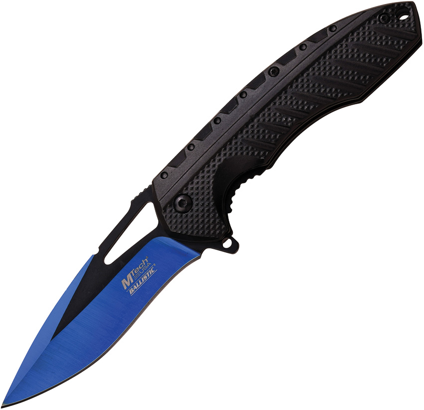 Assisted opening. 4.75″ closed. 3.5″ two-tone finish stainless drop point blade. Black textured aluminum handle. Pocket clip. Lanyard hole. Extended tang. Black and blue blade.