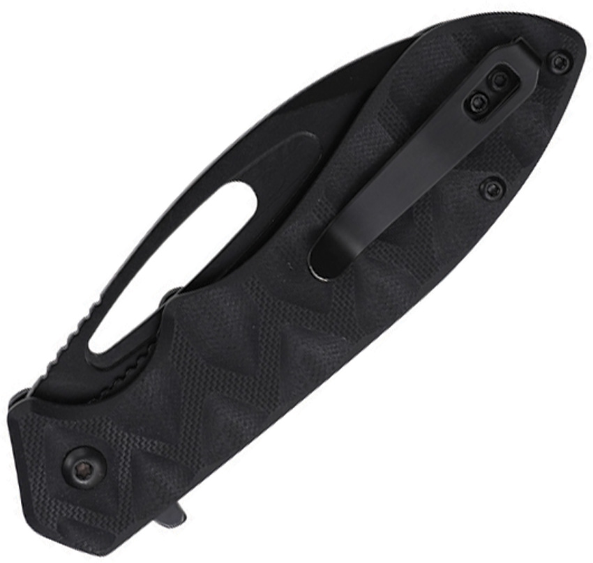 Assisted opening. 4.5″ (11.43cm) closed. 3.38″ (8.59cm) black oxide coated 3Cr13MoV stainless blade. Black sculpted G10 handle. Extended tang. Thumb pull. Pocket clip. Boxed.