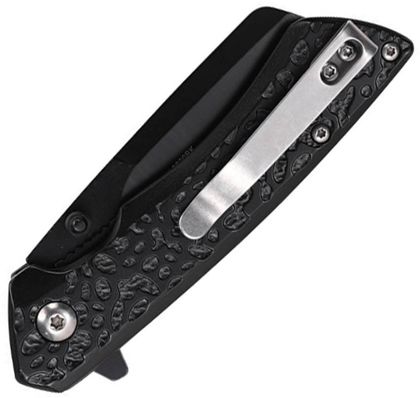 Assisted opening. 4″ (10.16cm) closed. 2.63″ (6.68cm) black oxide coated 3Cr13MoV stainless sheepsfoot blade. Black textured aluminum handle. Extended tang. Thumb stud. Pocket clip. Boxed.