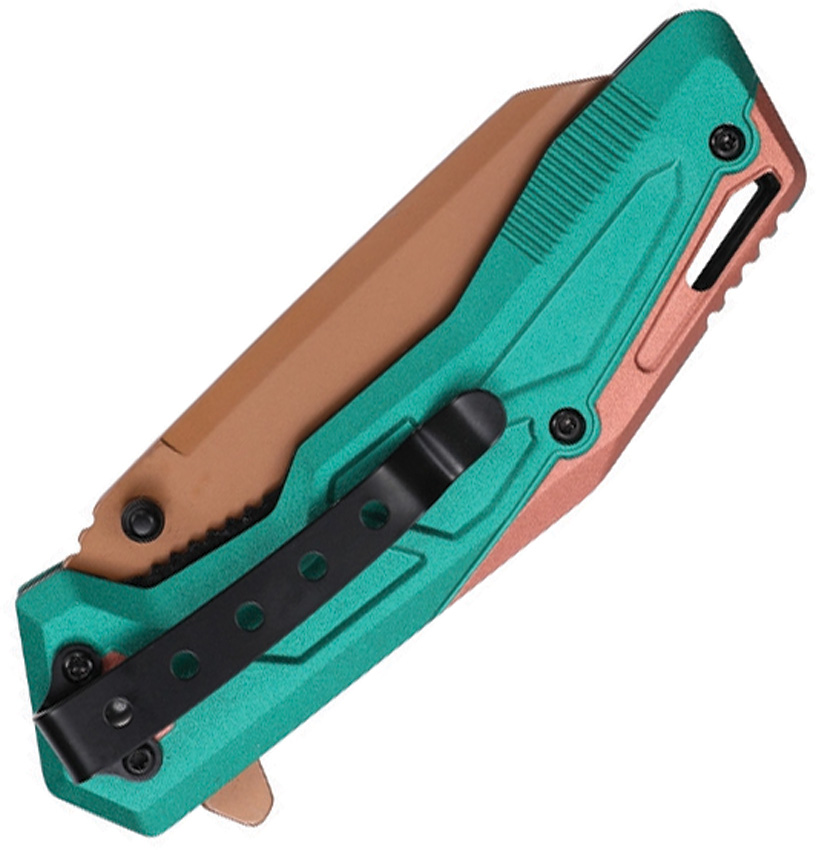 Assisted opening. 4.75″ (12.07cm) closed. 3.5″ (8.89cm) bronze TiNi coated 3Cr13MoV stainless blade. Green and tan anodized aluminum handle. Extended tang. Thumb stud. Lanyard hole. Pocket clip. Boxed.