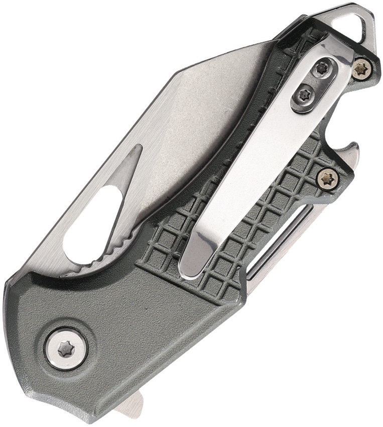 Assisted opening. 3.25″ (8.26cm) closed. 2.25″ (5.72cm) stonewash and satin finish stainless reverse tanto blade. Dark gray textured aluminum handle. Bottle opener. Lanyard hole. Thumb pull. Pocket clip. Boxed.