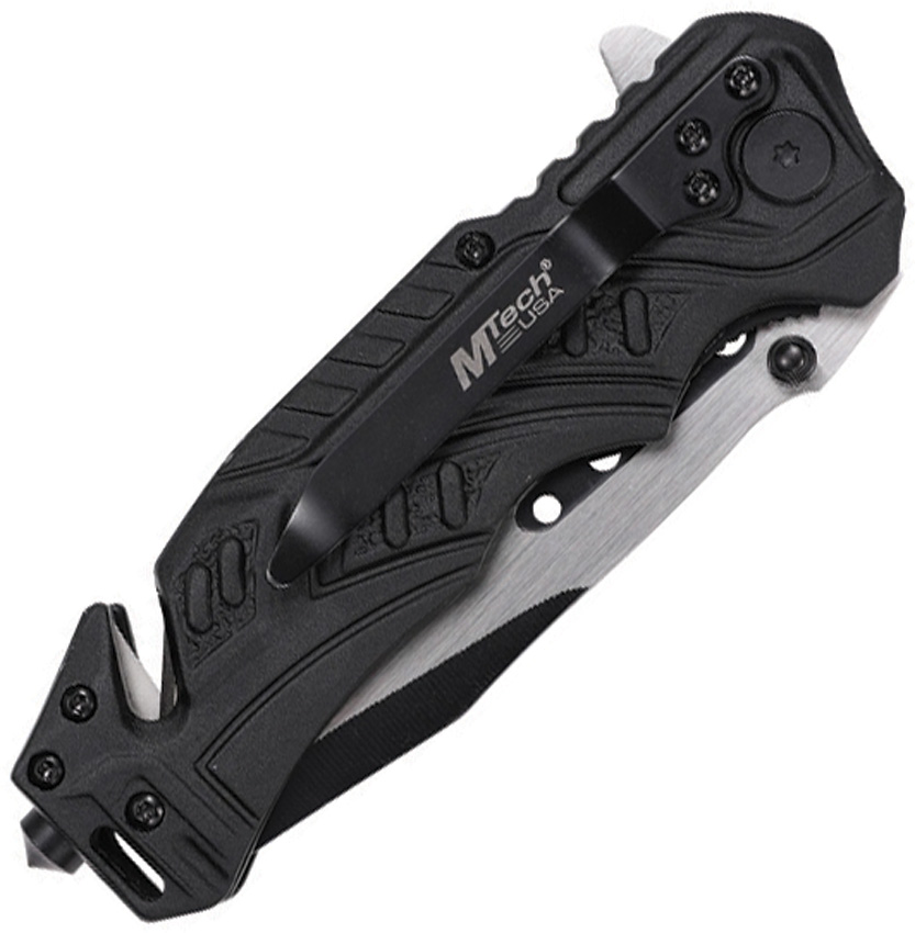 Assisted opening. 4.75″ (12.07cm) closed. 3.38″ (8.59cm) two-tone finish partially serrated 440 stainless blade. Black and gray anodized aluminum handle. Thumb stud. Extended tang. Belt/cord cutter. Glass breaker. Pocket clip. Sheriff inlay shield. Boxed.