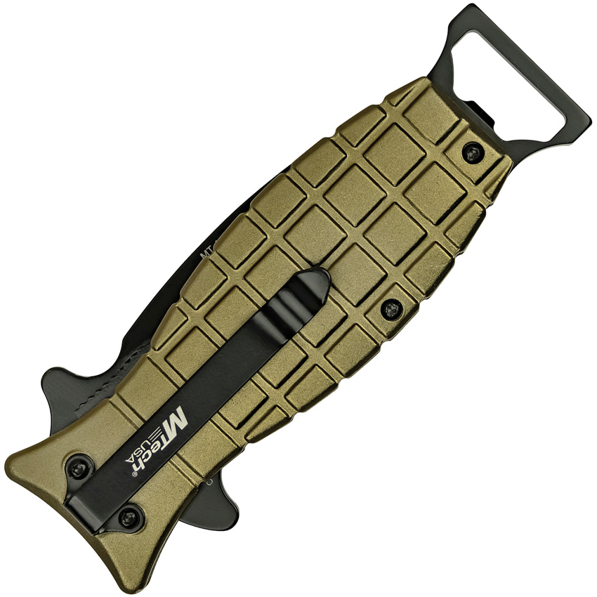Black Oxidized Stainless Steel Blade, Green Aluminum Grenade Style Handle with Bottle Opener, Liner Lock and Pocket Clip.