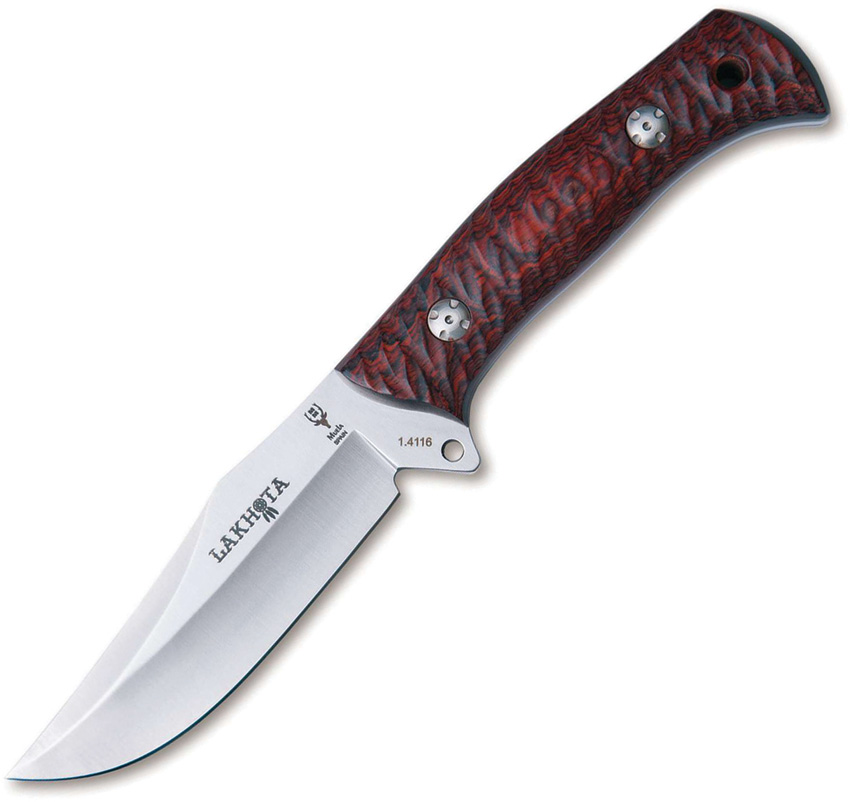 10″ (25.4cm) overall. 5″ (12.7cm) satin finish 1.4116 stainless clip point blade. Red sculpted Sandalwood handle. Full tang. Lanyard hole. Brown leather belt sheath. Boxed.