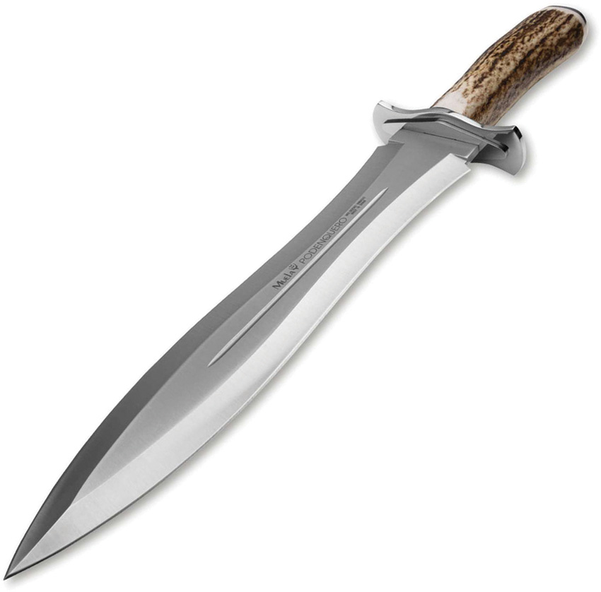 16.13″ (40.97cm) overall. 10.5″ (26.67cm) satin finish double edge 1.4116 stainless blade. Stag handle. Stainless guard. Brown leather belt sheath. Boxed.