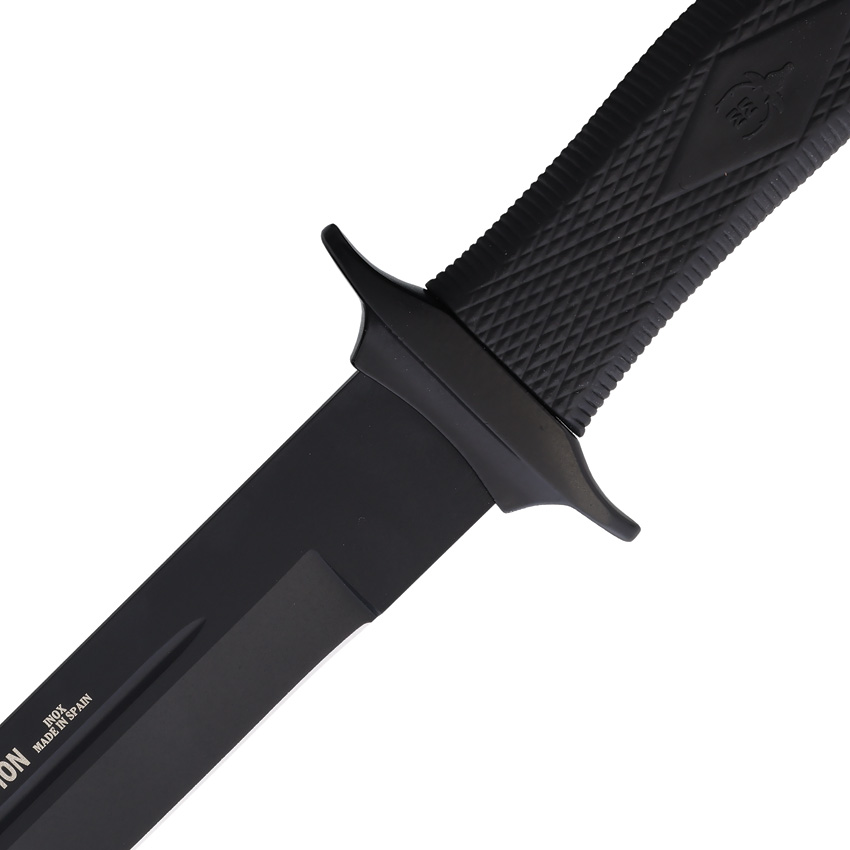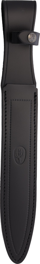 14.75″ (37.47cm) overall. 10″ (25.4cm) black coated false edge stainless spear point blade. Black checkered rubber handle. Synthetic guard. Lanyard hole. Black leather belt sheath. Boxed.