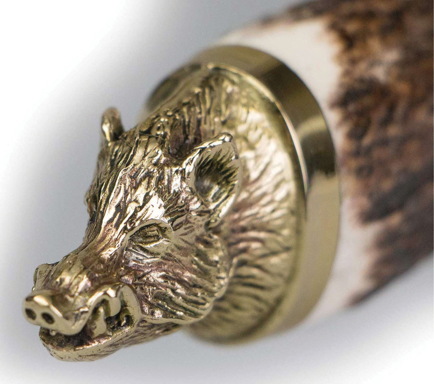 11.5″ (29.21cm) overall. 5.5″ (13.97cm) satin finish 1.4116 stainless bowie blade. Stag handle. Brass guard and pommel. Exclusive collector s box. Boar’s head shaped pommel. Brown leather belt sheath. Boxed.