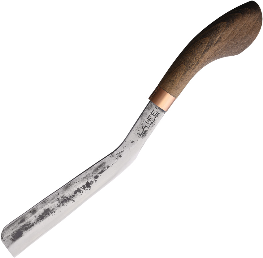 17″ (43.18cm) overall. 10″ (25.4cm) 5160 carbon steel blade. Renewable eco wood handle with copper bolster. Brown leather belt sheath. Boxed.