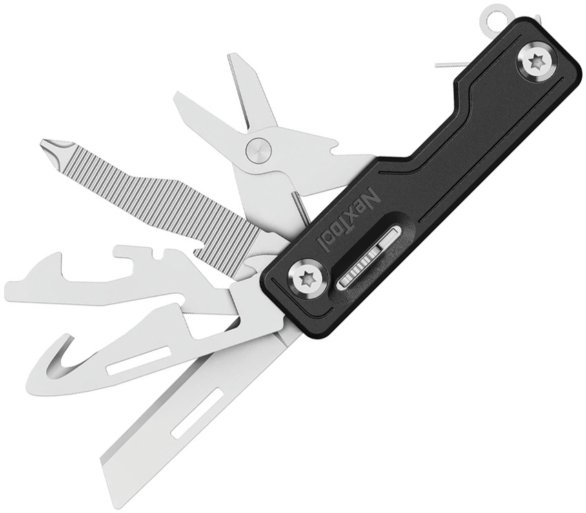 3″ (7.62cm) closed. Black ABS handle. Tools include: Small blade l Belt/cord cutter l Screwdriver tip l Can opener l Bottle opener l Phillips screwdriver l File l Scissors l Lanyard loop. Boxed.