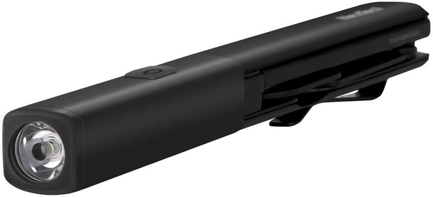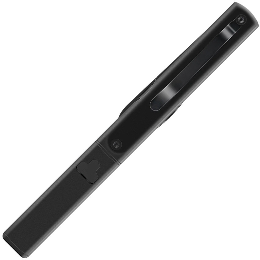 5.5″ overall. Tools include: Small blade l Scissors l Light l Pocket clip. Black aluminum body. Power switch/charging indicator. Type-C charging port. Boxed.