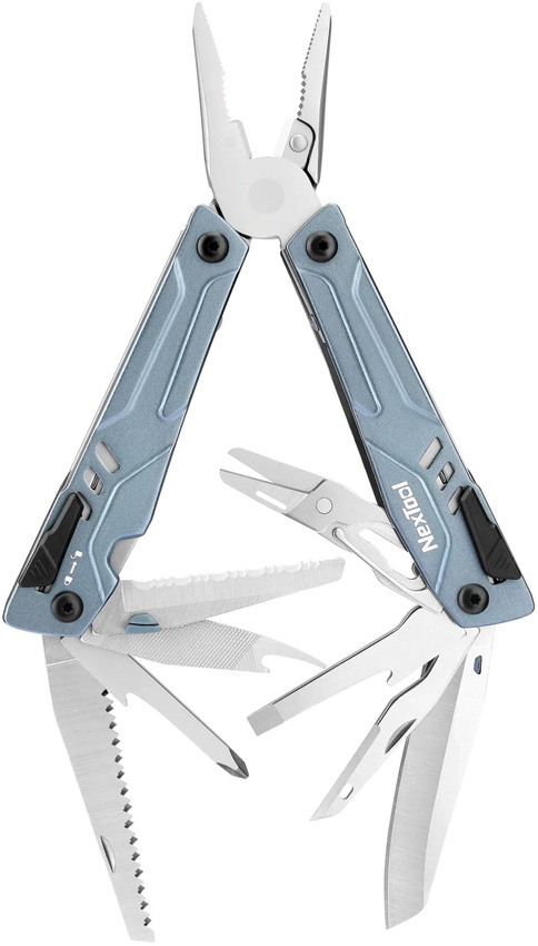 4.13″ closed. Blue-gray stainless handles. Tools include: Needlenose pliers l Pliers l Wire cutter l Small blade l Scissors l Saw blade l Phillips screwdriver l Flat head screwdriver l Awl l Bottle opener l Serrated blade l File. Marlin spike. Dual safe-locking (except the pliers head). Boxed.