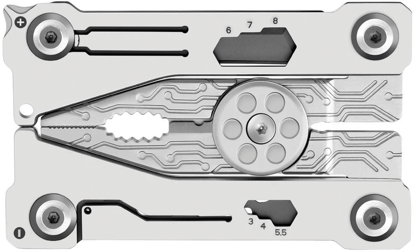 Dimensions: 3.34″ x 2.04″ x 0.28″. Titanium finish stainless handle. Tools include: Hex/Bit driver l Pliers l Wire stripper l Wire cutter l Ruler l Small blade l Bottle opener l Flat head screwdriver. Hexagon spanner. Credit card size. Brown leather pouch. Boxed.