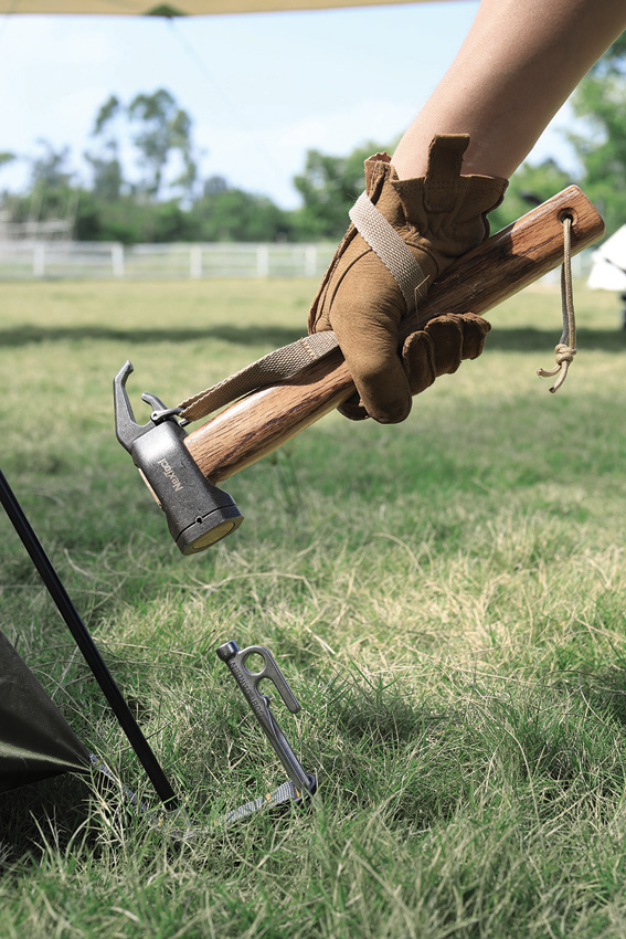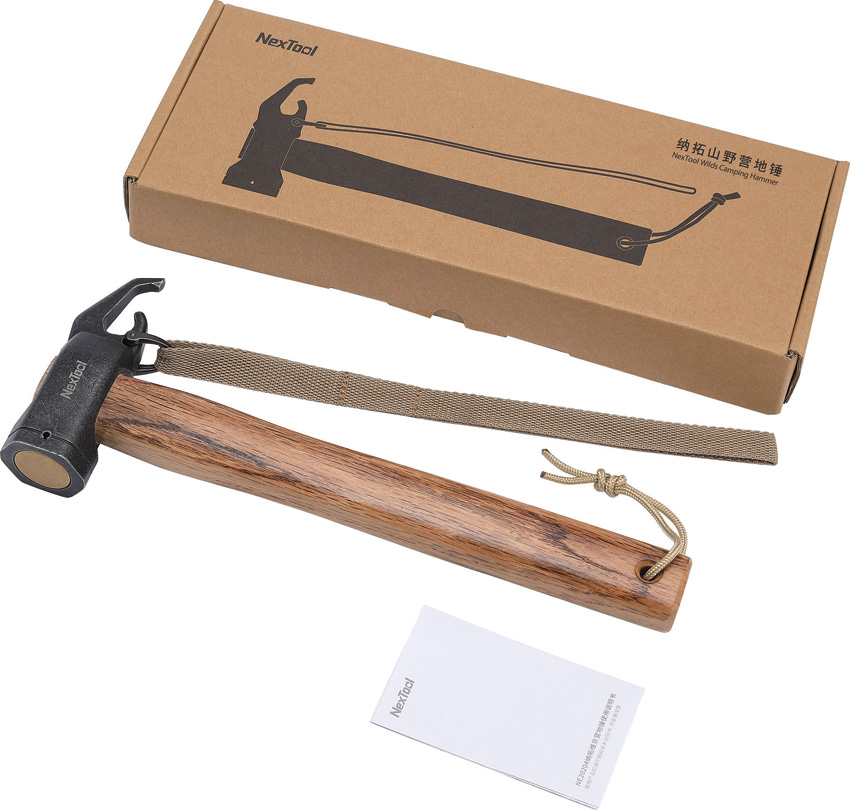 11.5″ (29.21cm) overall. Beech wood handle. 420 stainless head. Unique hammer head design is cushioned and shock-proof, reducing wrist strain and protecting the tent pegs while also minimizing noise. Rhino horn curved hook. Boxed.