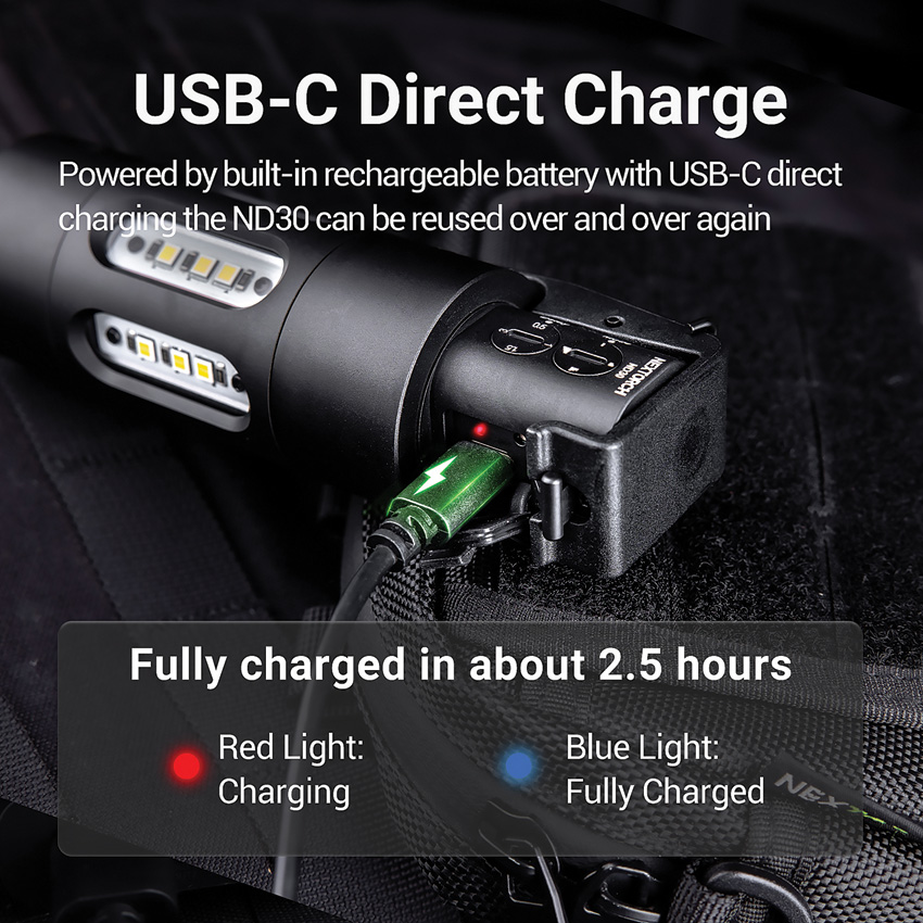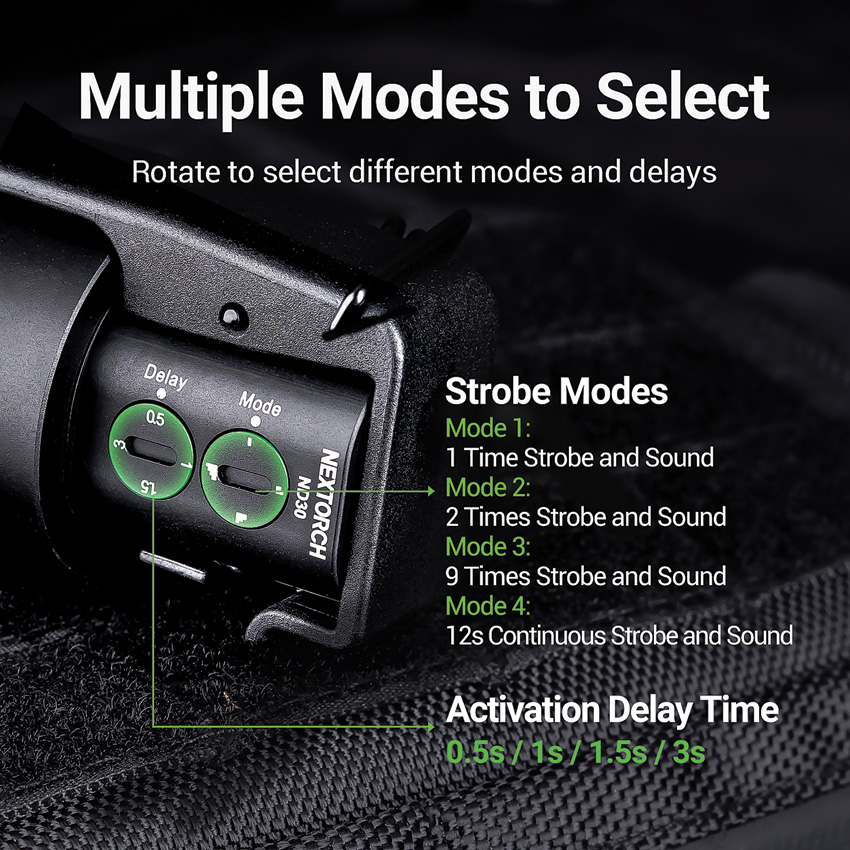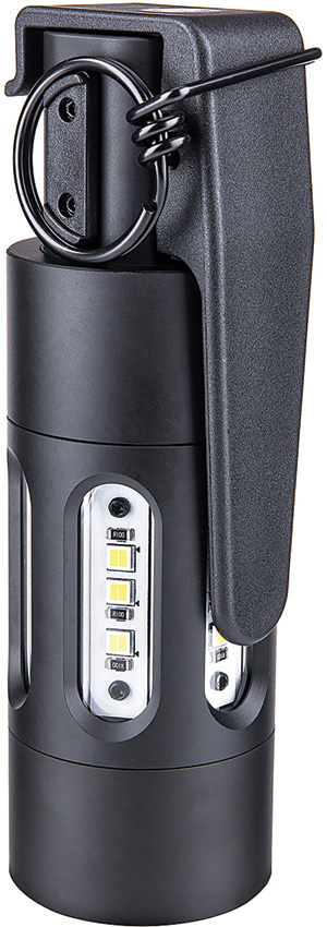Dimensions: 5″ x 1.57″. Rechargeable. Water resistant. Impact resistant. 11000 lumens, 130dB sound intensity. Four strobe/sound modes. Modes: 1 Time; 2 Times; 9 Timesl 12s continuous. 70m beam distance. Aluminum construction. Boxed with hanging tab.