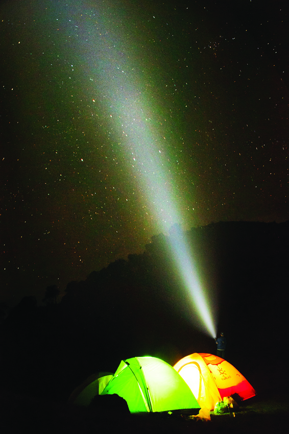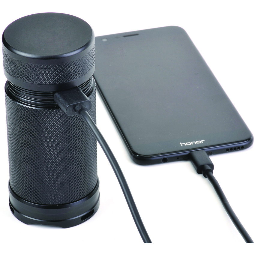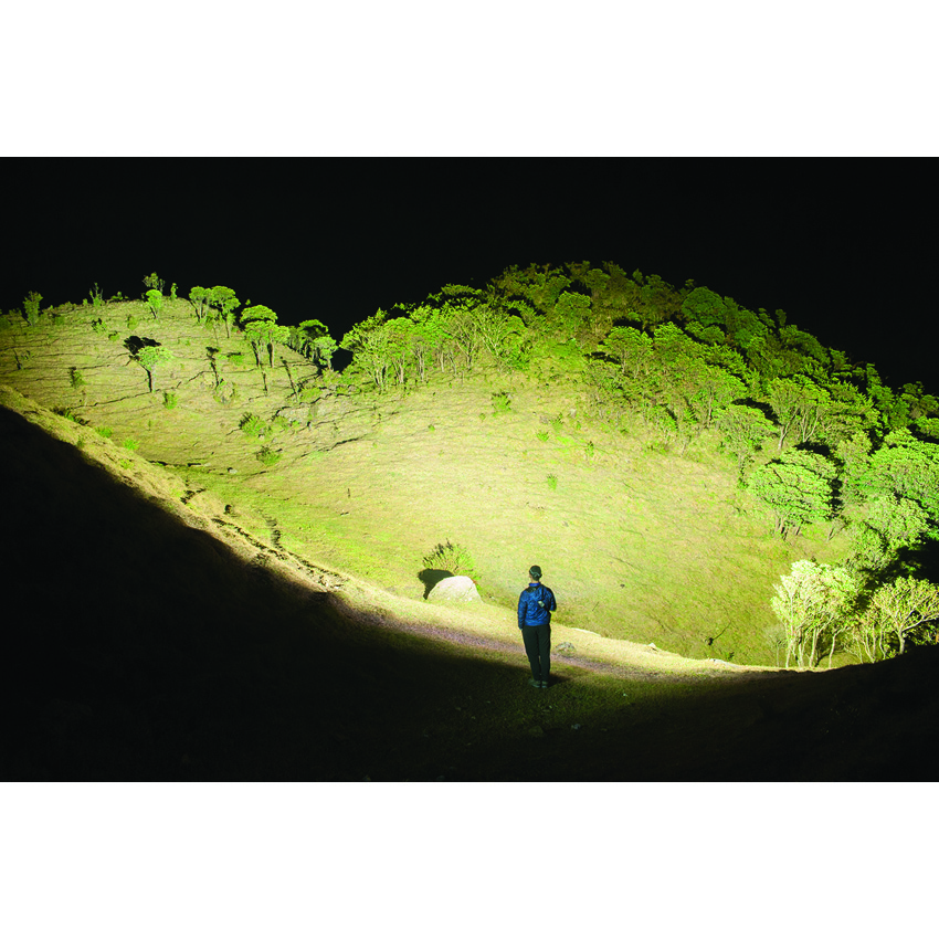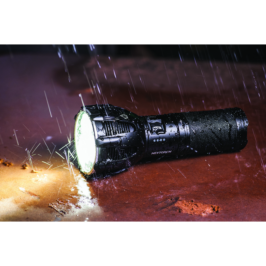 SOS strobe. Strobe. Water resistant. Impact resistant. Rechargeable. Three CREE XHP50.2-K4 LEDs. Modes: Turbo (8000 lumens, 2h 15m runtime); High (2400 lumens, 4h runtime); Medium (720 lumens, 7h 30m runtime); Low (90 lumens, 60h runtime). 530m beam distance. Powered by 4 x 2600mAh rechargeable Li-ion battery pack. Includes: Multi-function carry bag, Charger and cable, Seal cover, and Shoulder strap. Aluminum construction. Color: Black. Boxed.