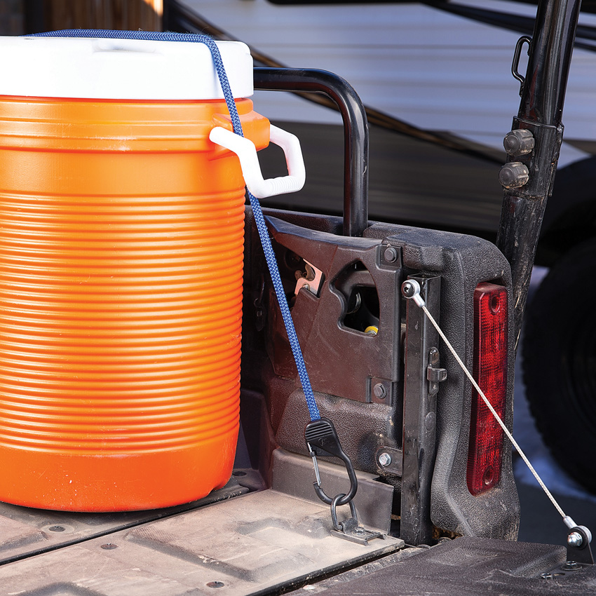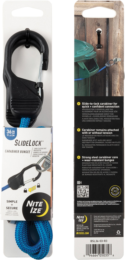 36″ overall. Slide-to-Lock carabiner for a quick and confident connection. Carabiner remains attached with or without tension. Strong steel carabiner core. Wear-resistant bungee. Hang packaged.