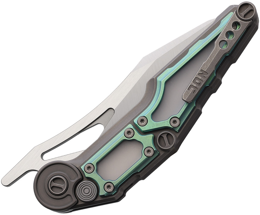 4.75″ (12.07cm) closed. 3.5″ (8.89cm) satin finish Bohler M390 stainless Wharncliffe blade. Gray titanium handle with Green anodized titanium onlay. Extended tang. Thumb pull. Pocket clip. Storage case.