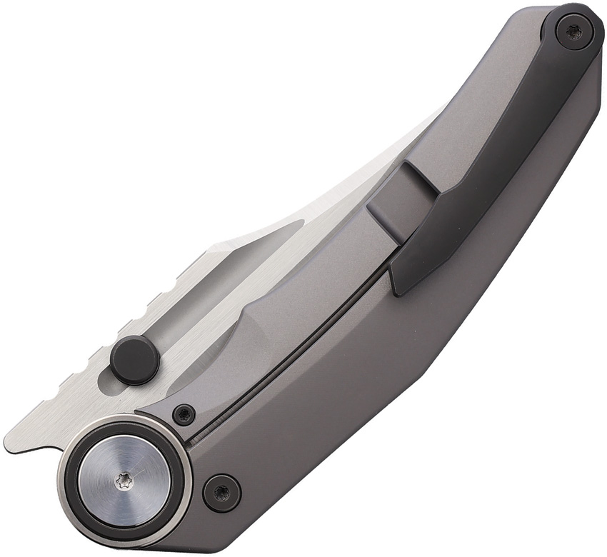 4.63″ (11.76cm) closed. 3.5″ (8.89cm) satin finish Bohler M390 stainless clip point blade. Gray titanium handle. Thumb stud. Pocket clip. Storage case.
