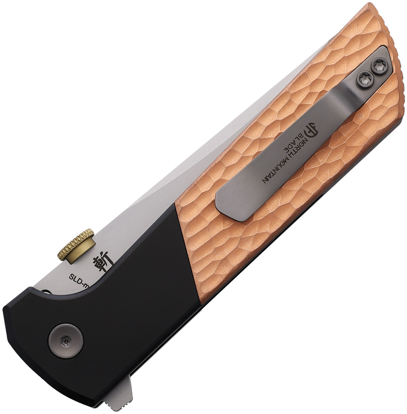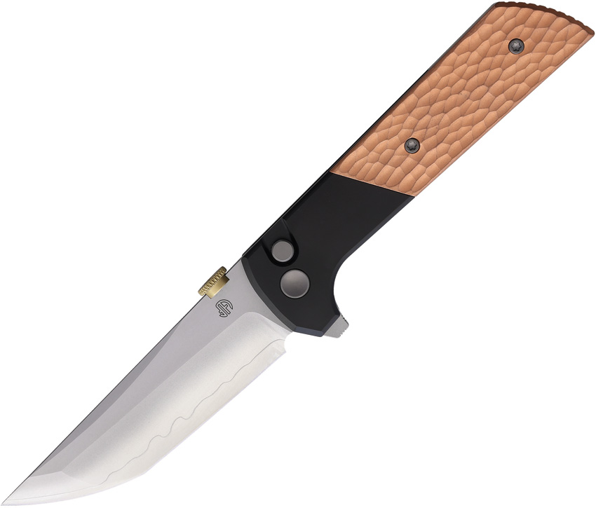 4.38″ (11.13cm) closed. 3.5″ (8.89cm) blade. Extended tang. Copper hammered pattern SLD-Magic steel tanto blade. Hammered copper and black aluminum handle. Black molded plastic storage case. Boxed.