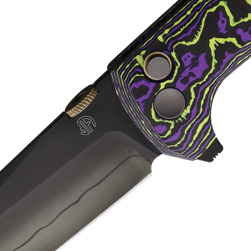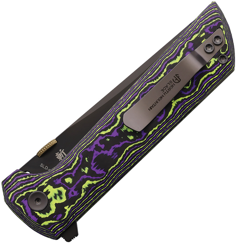 4.5″ (11.43cm) closed. 3.5″ (8.89cm) black DLC coated blade. Green and purple carbon fiber handle. Extended tang. Pocket clip. SLD-Magic SAN MAI tanto blade. .45 style thumb disk. Molded plastic storage case. Boxed.