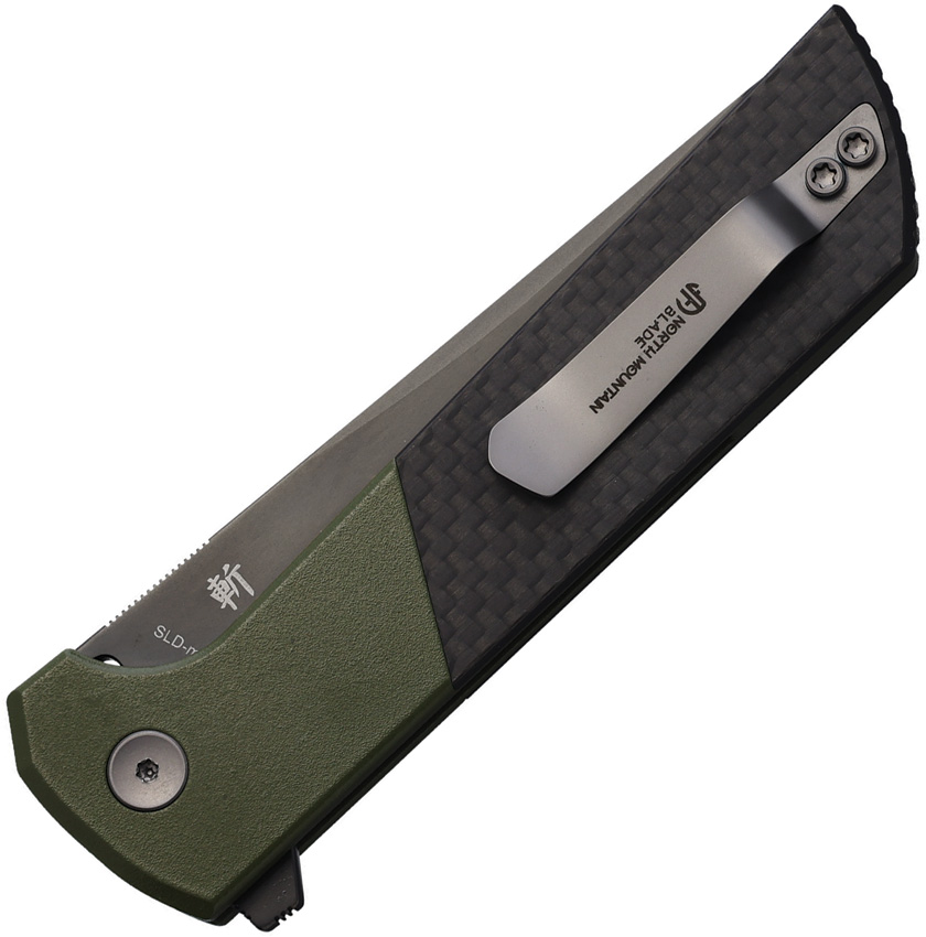 4.5″ (11.43cm) closed. 3.5″ (8.89cm) blade. Carbon fiber handle. Aluminum bolster(s). Extended tang. Pocket clip. SLD-Magic SAN MAI tanto blade. Green bolster. Black molded plastic storage case. Boxed.