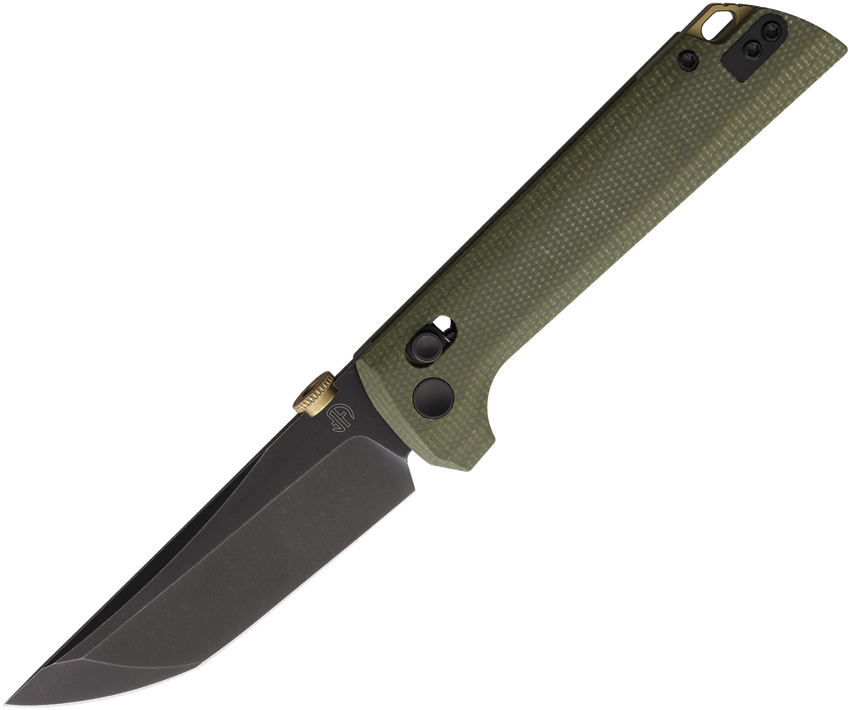 4.5″ (11.43cm) closed. 3.5″ (8.89cm) black finish D2 tool steel tanto blade. Green canvas micarta handle. Pocket clip. Extended tang. Boxed.